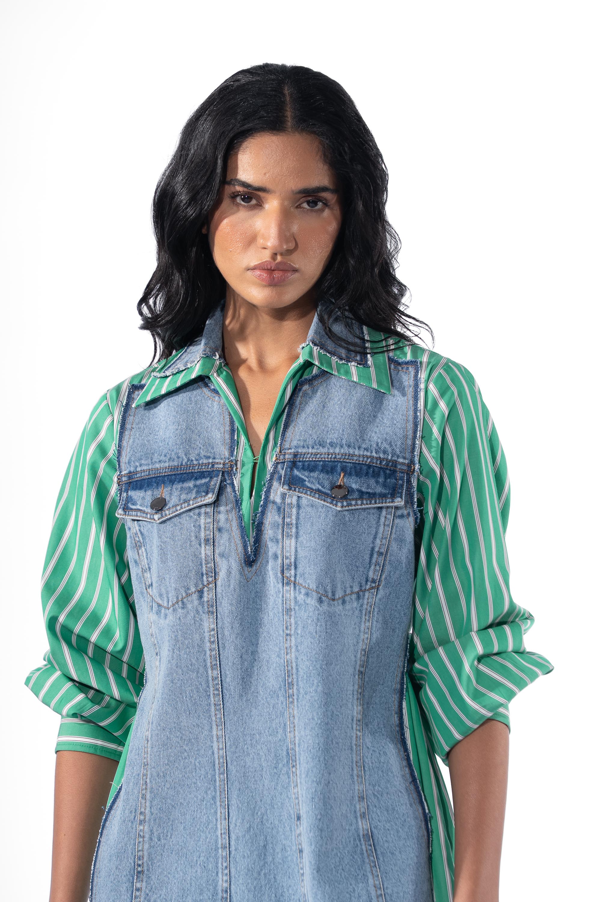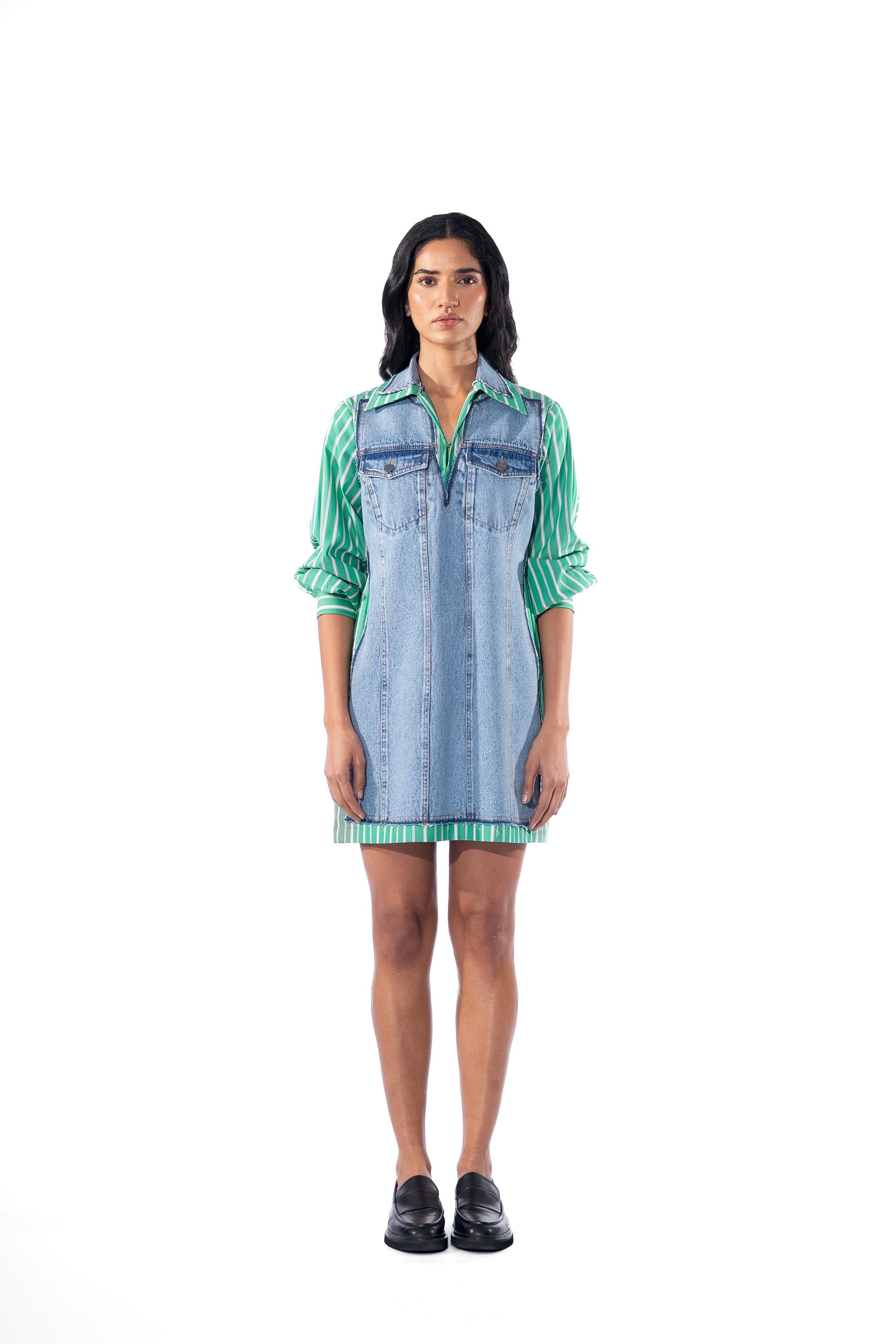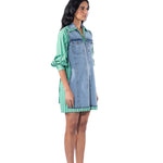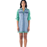 Light blue denim and green striper dress with drawstring at the waist