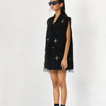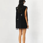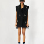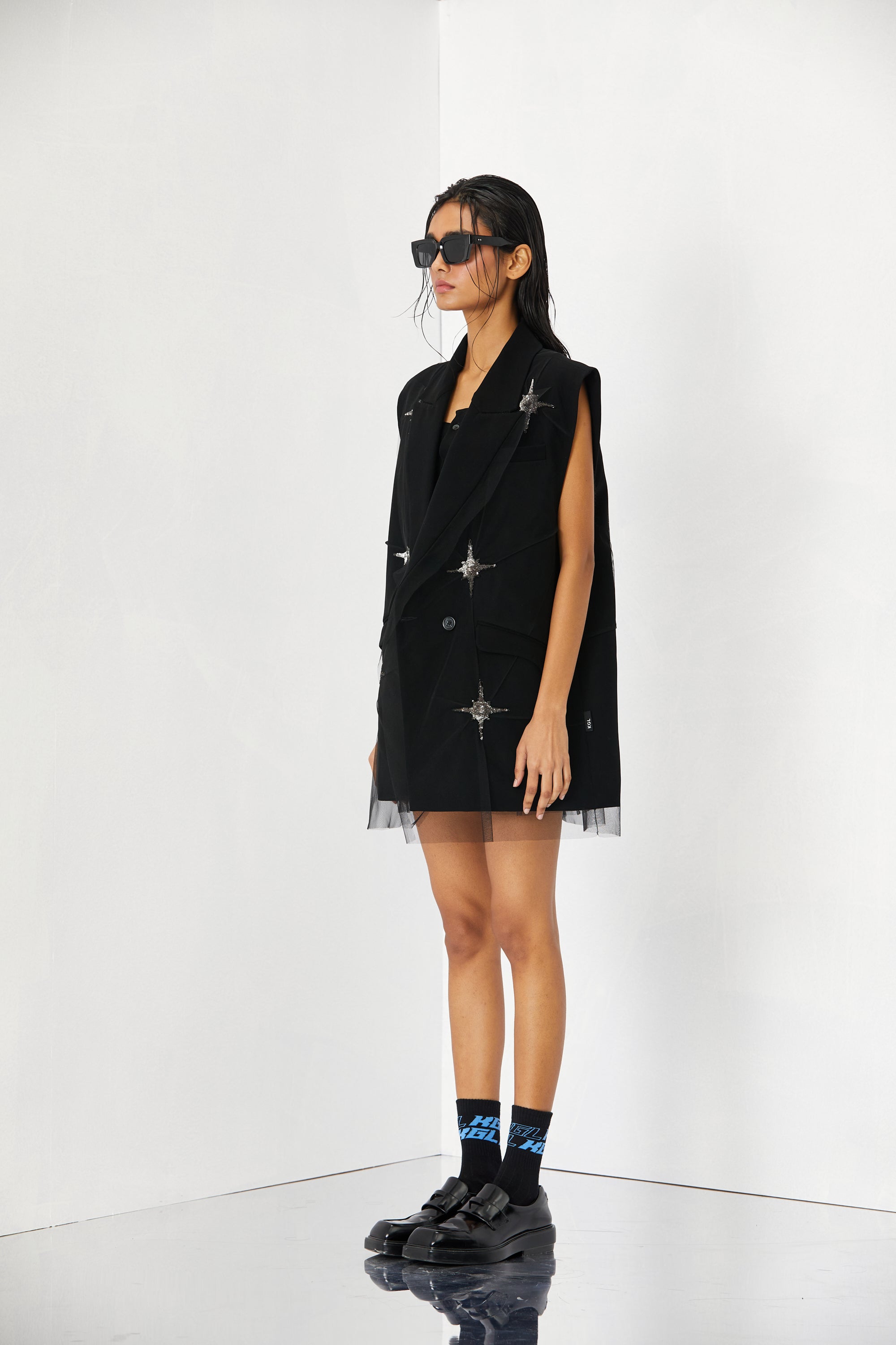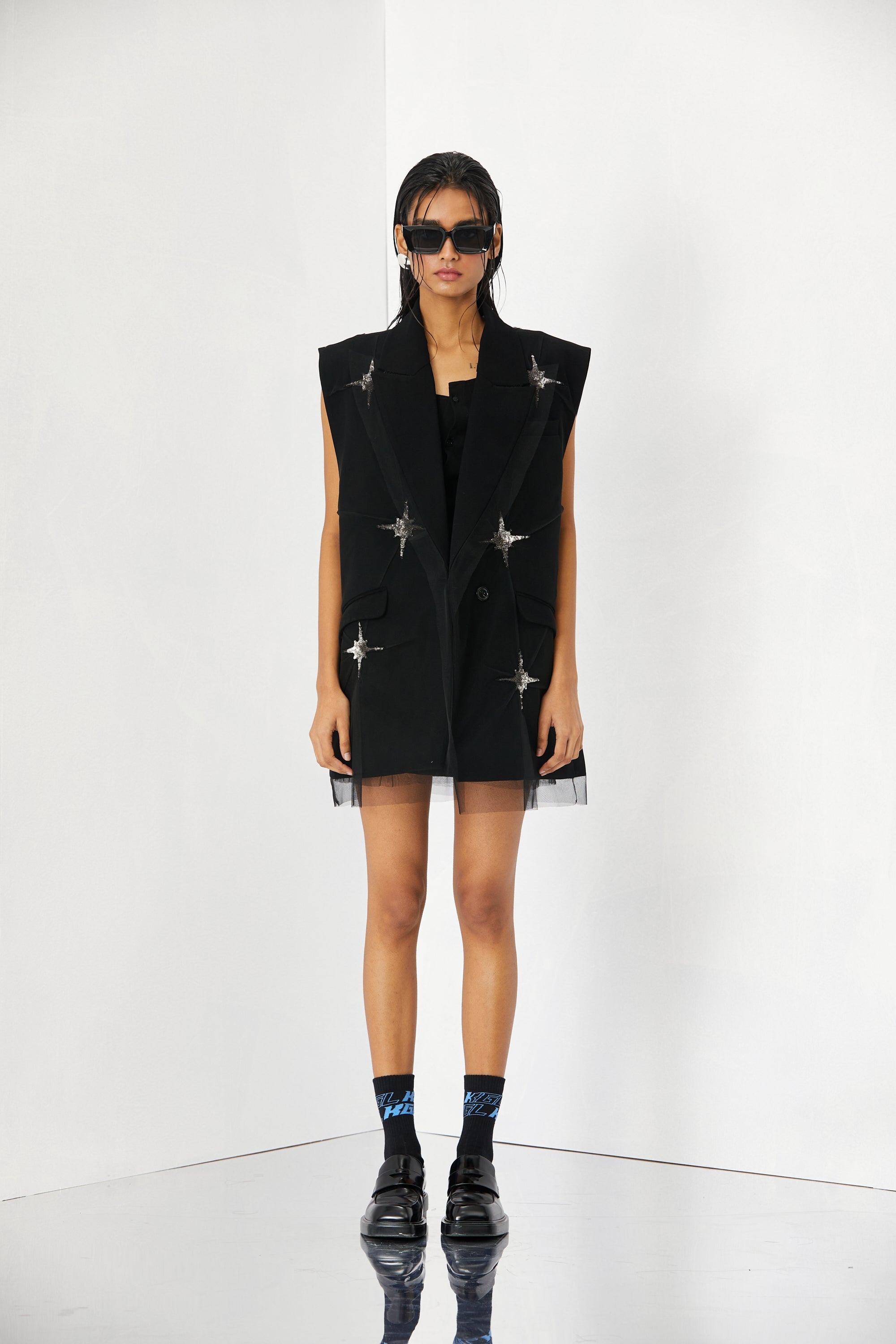 Black embellished blazer vest with a notched collar and pockets at the front. Length of the blazer vest is 32" Product Code: KGPF250017 Fit: Oversized Composition: 100% Polyester Care: Dry clean only * The model is a standard extra small size and is wearing a medium here.