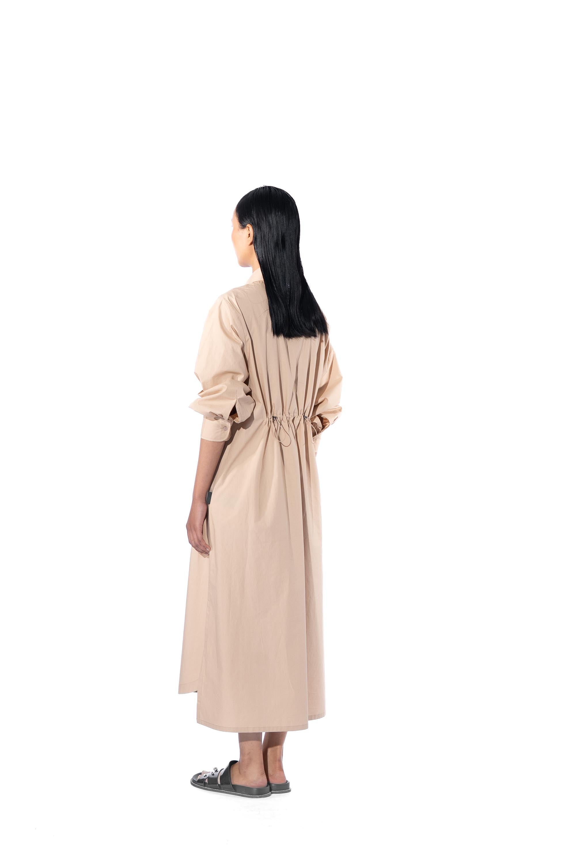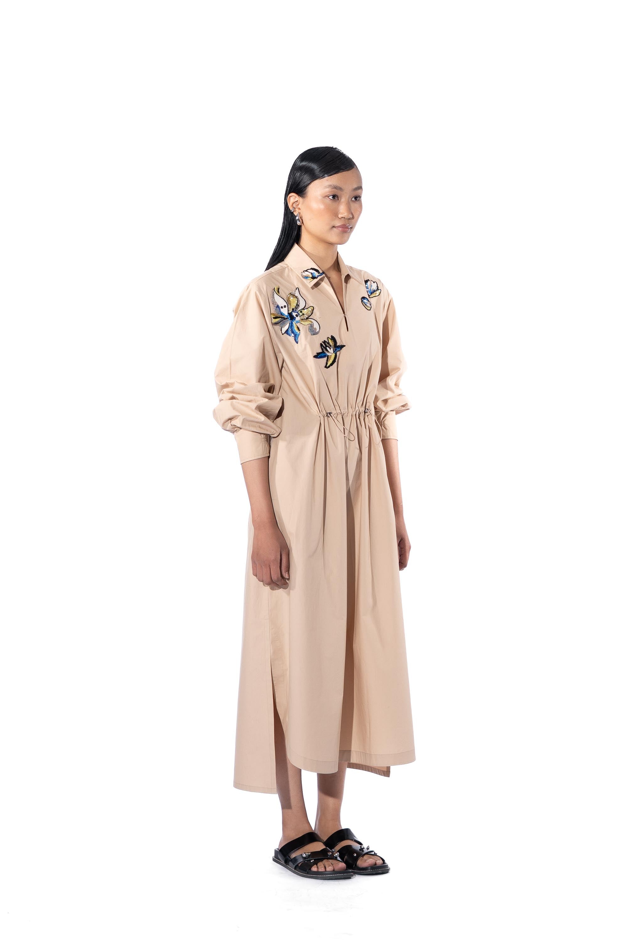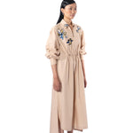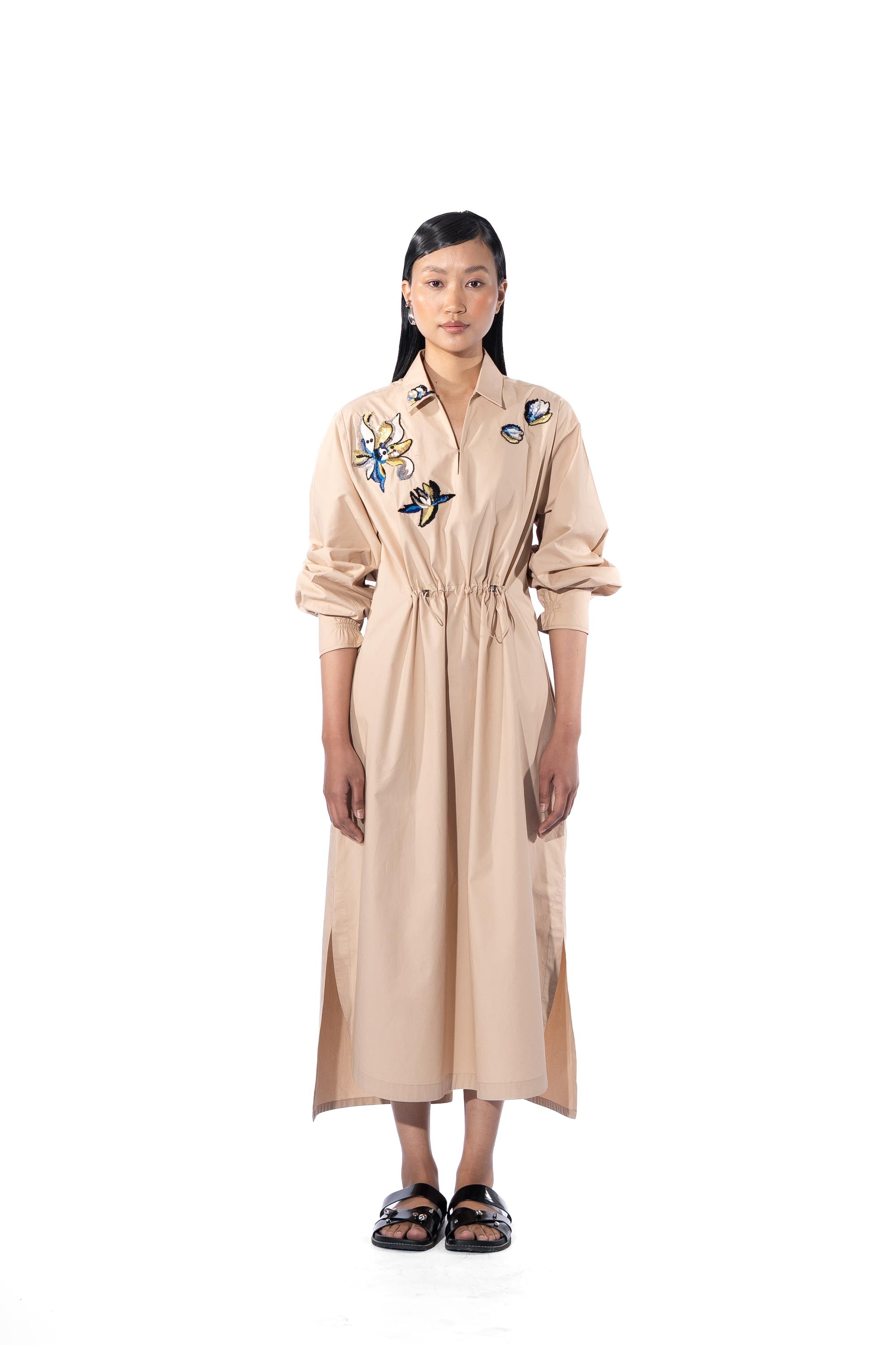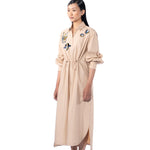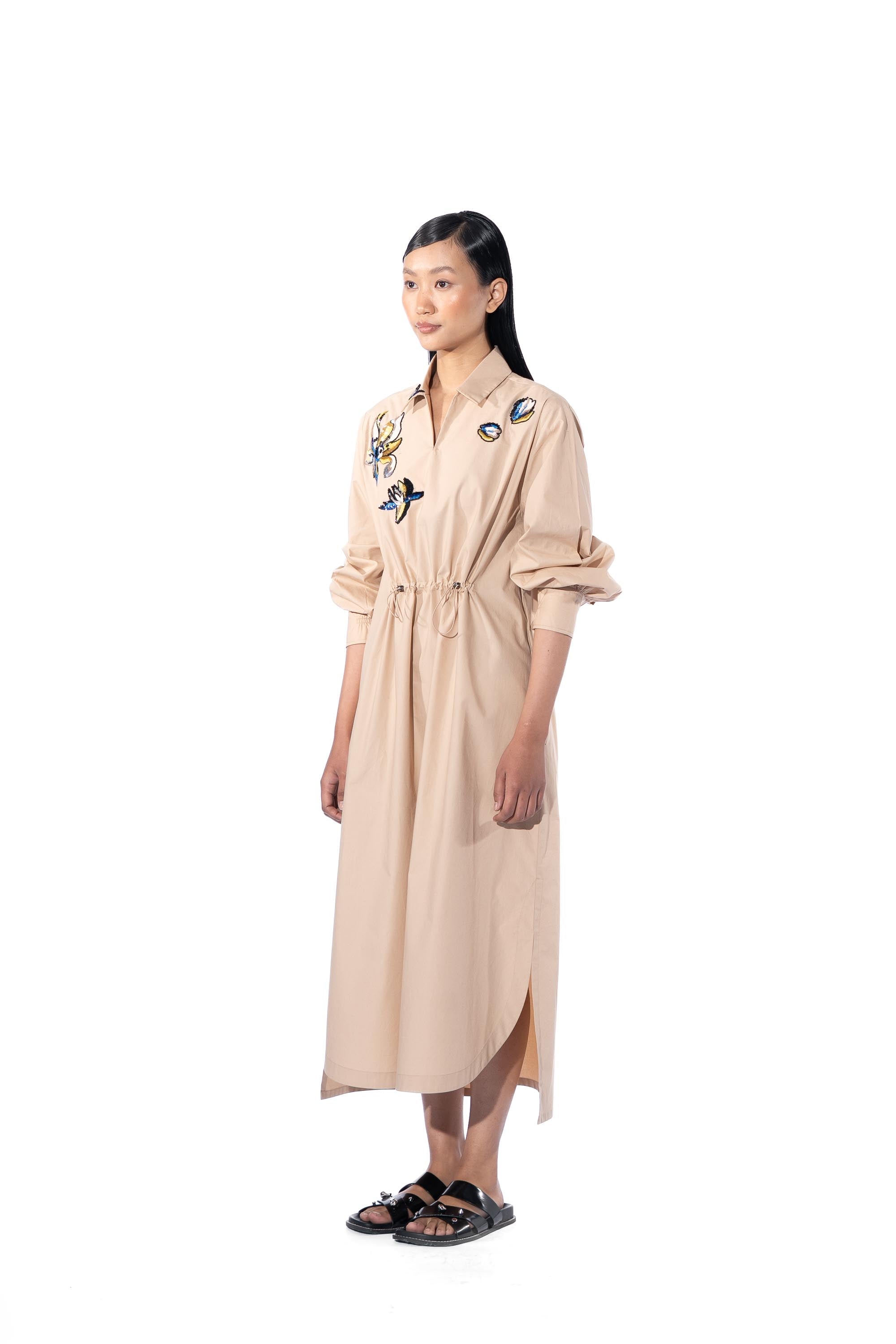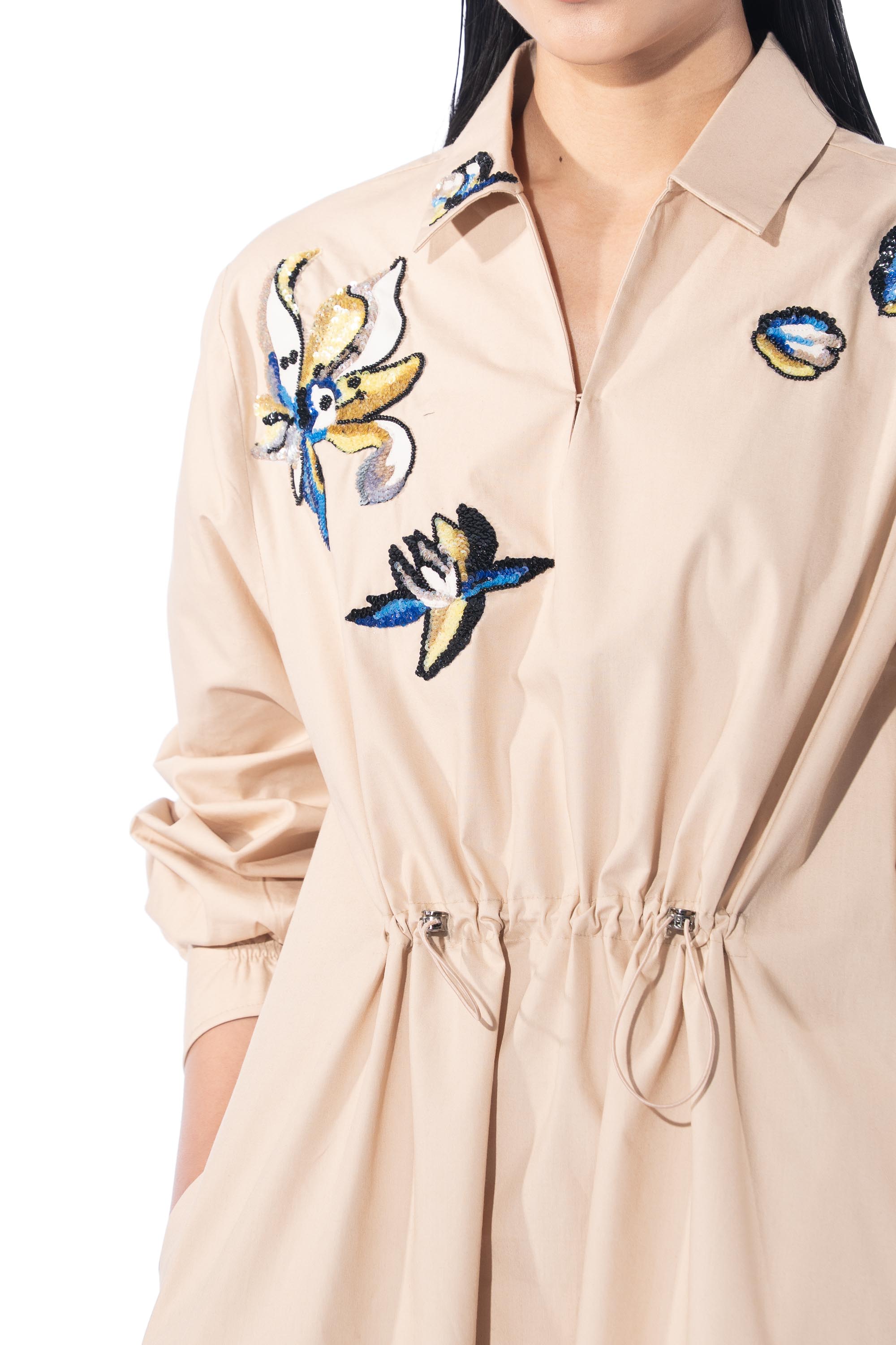 Beige embellished shirt dress with drawstrings at the waist