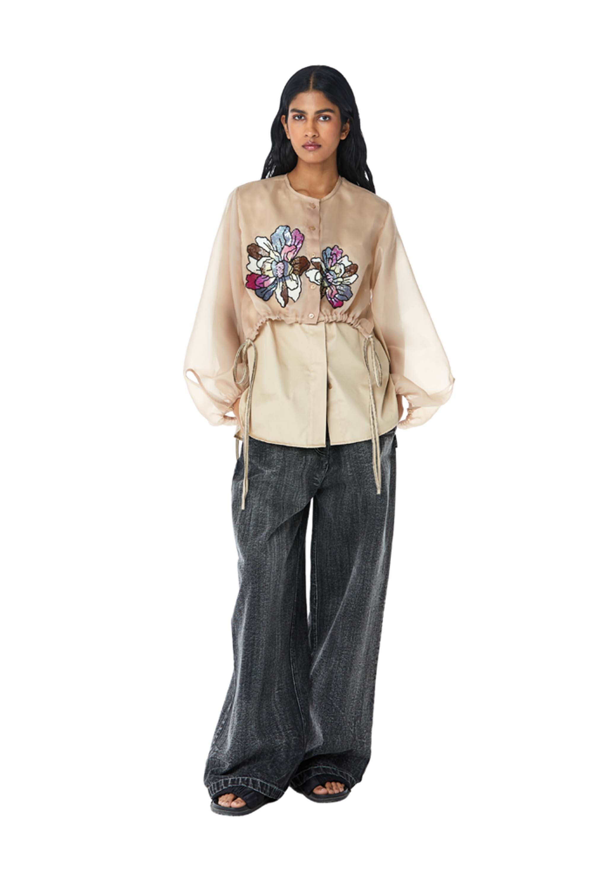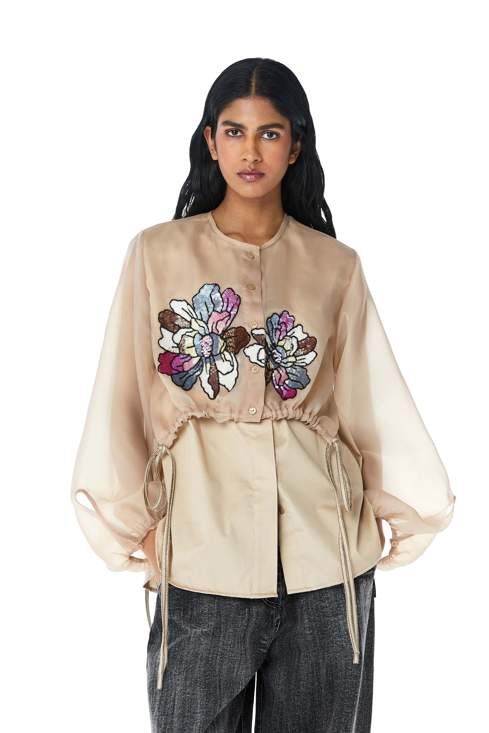 Beige embellished shirt with an organza overlay and drawstring at the hem. Length of the shirt is 28".