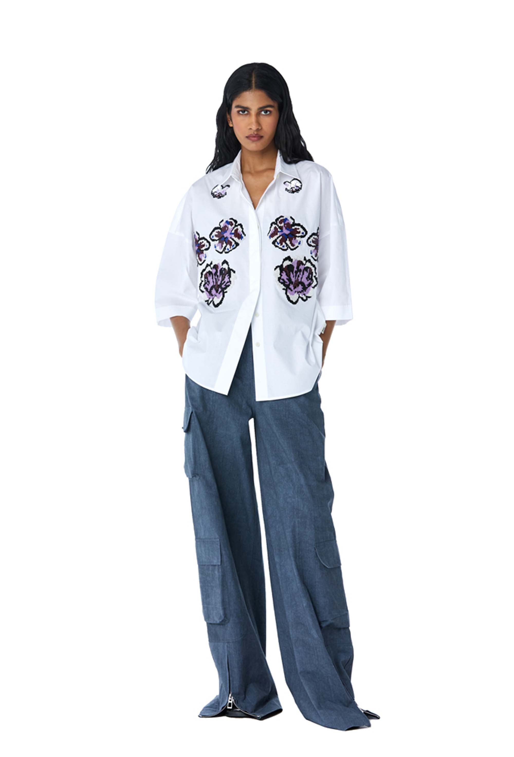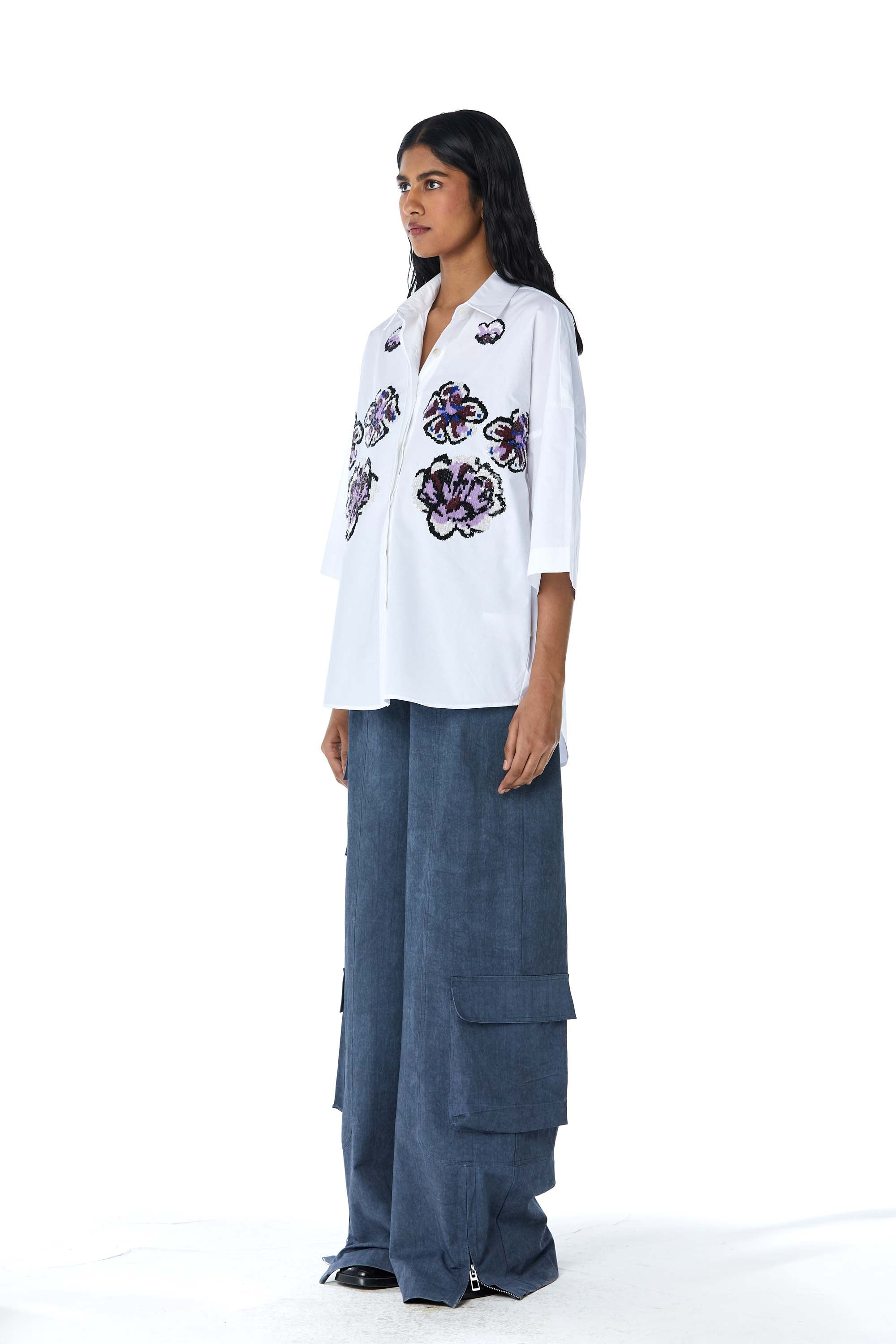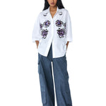 White hand-embellished shirt. Length of the shirt is 28".