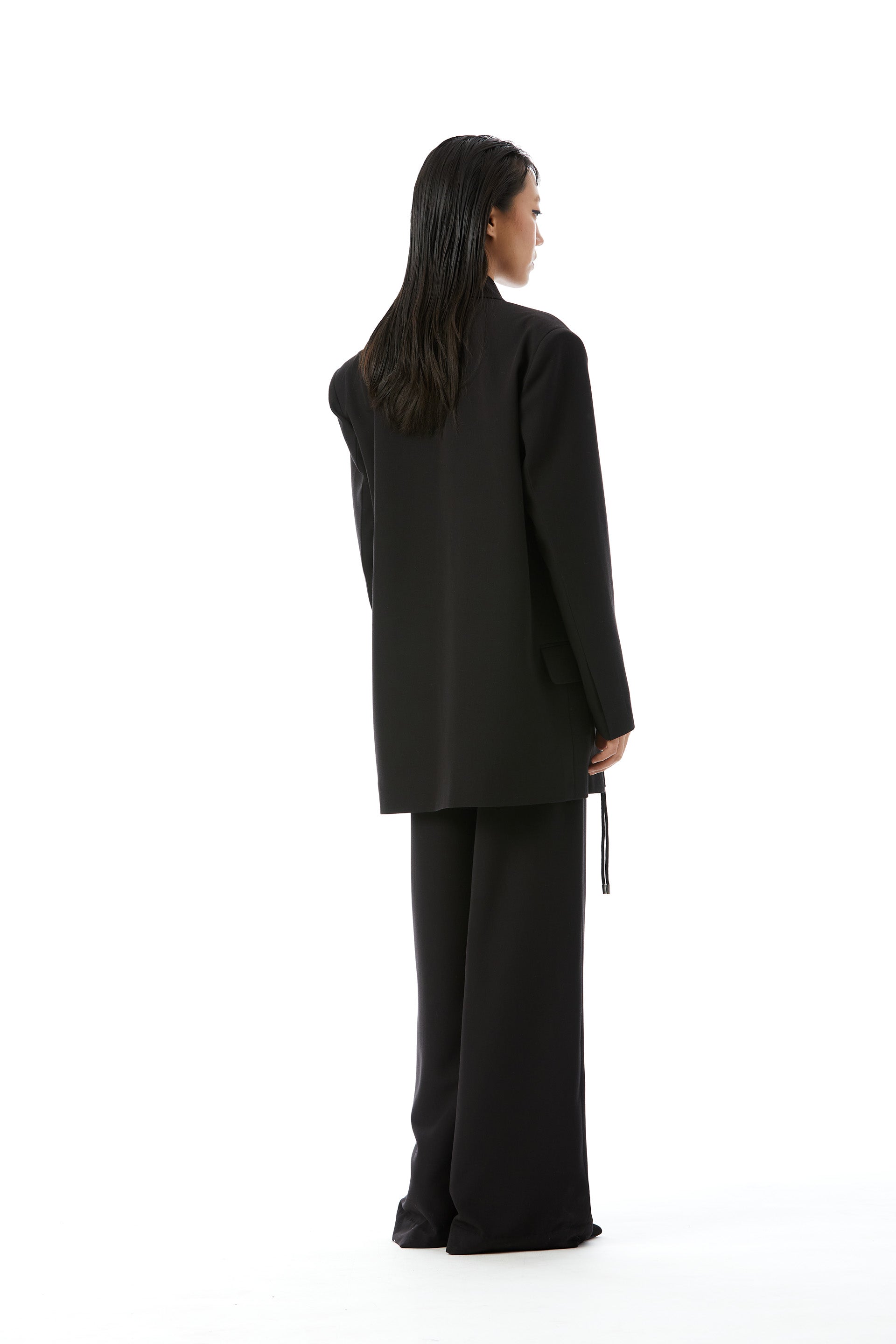 Black oversized blazer with front tie-up detailing. Length of the blazer is 31" The model is a standard small and 175 cms. She's wearing a small here.
