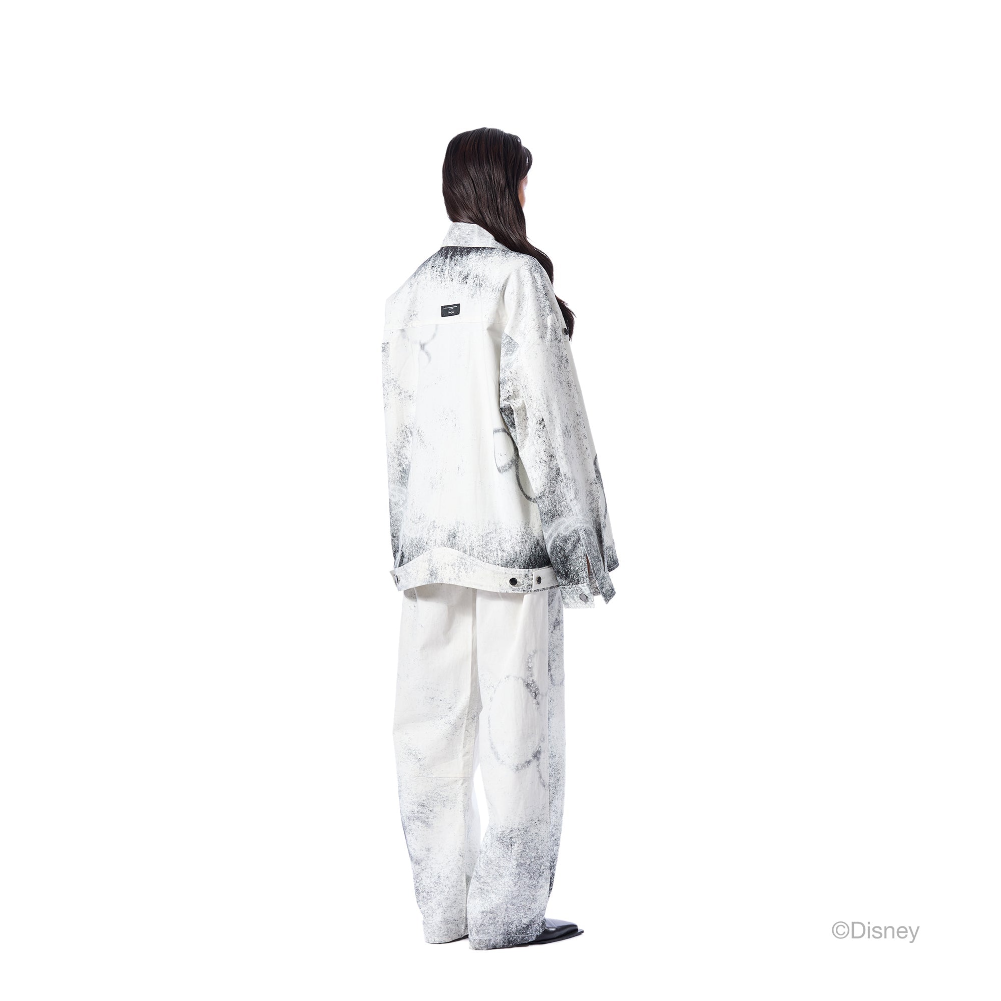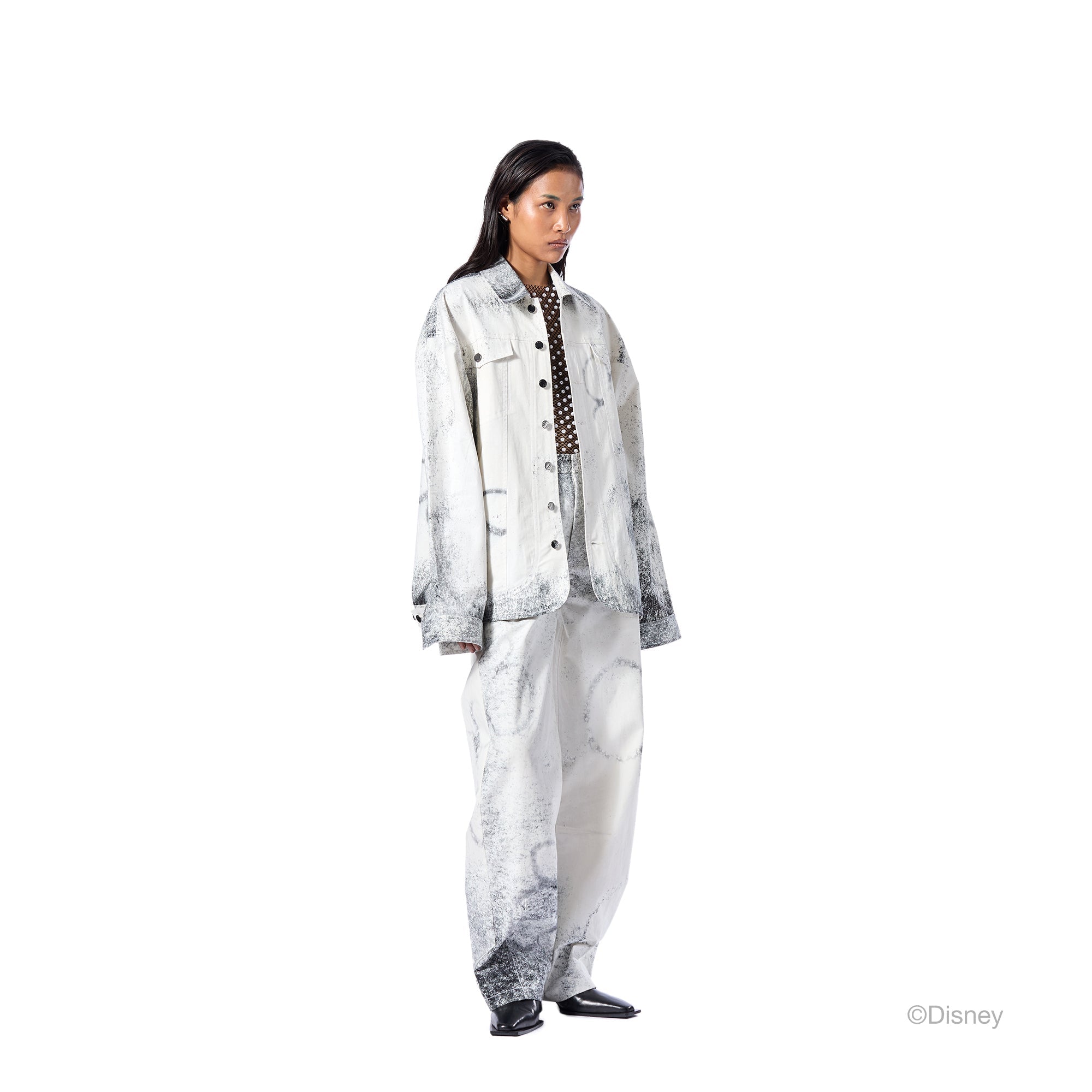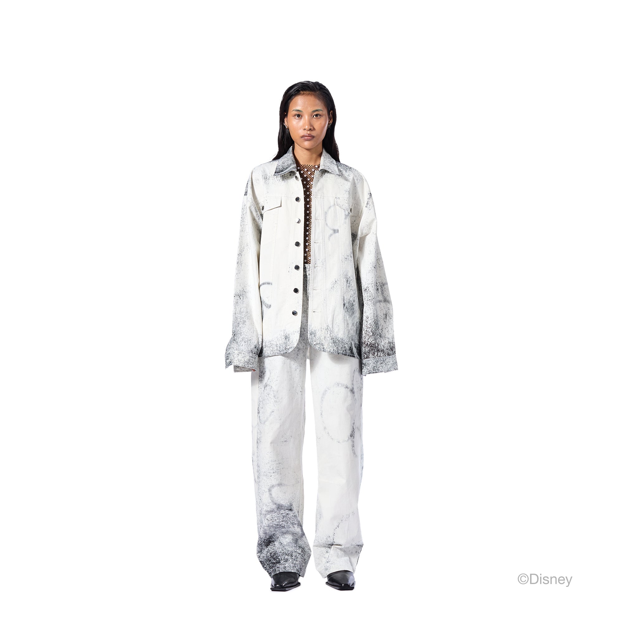 Twill printed pants with front button closure.