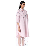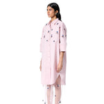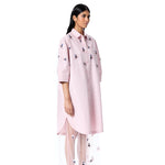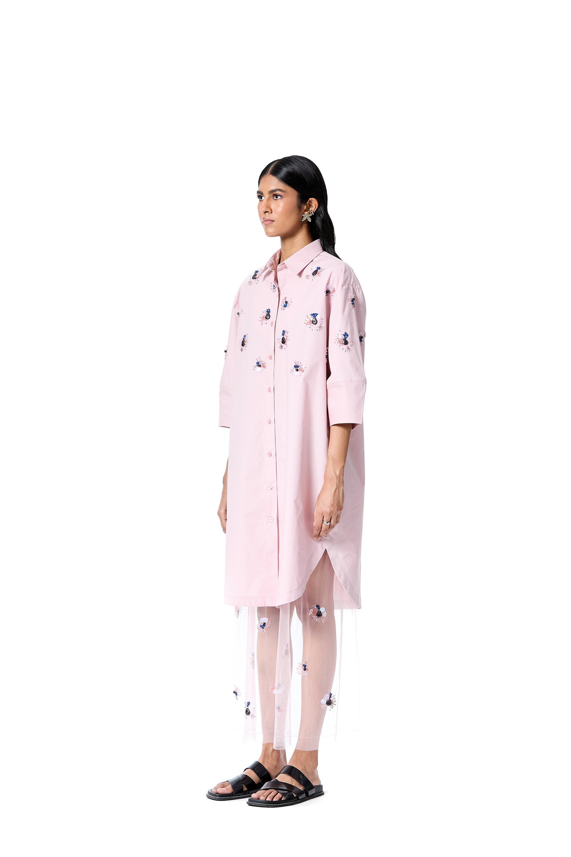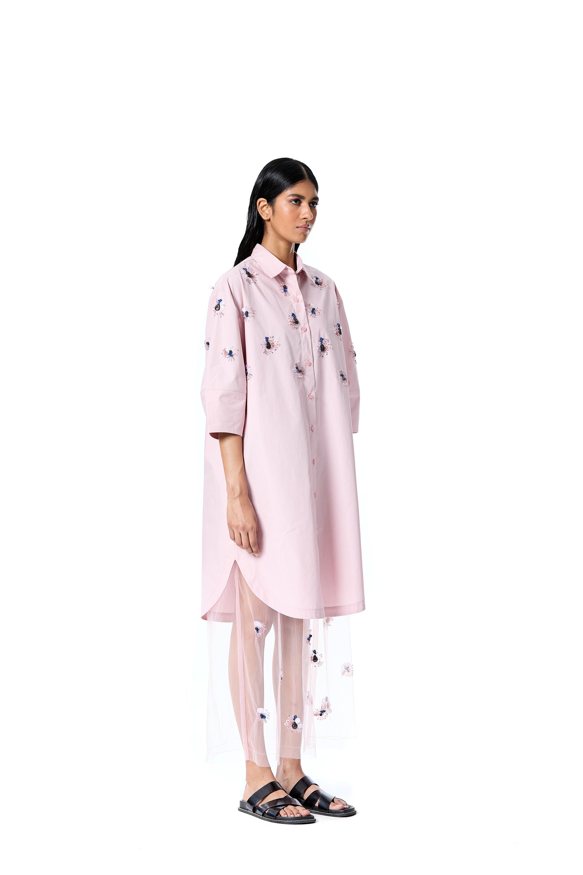 Embellished oversized shirt dress with an attached sheer tulle layer.